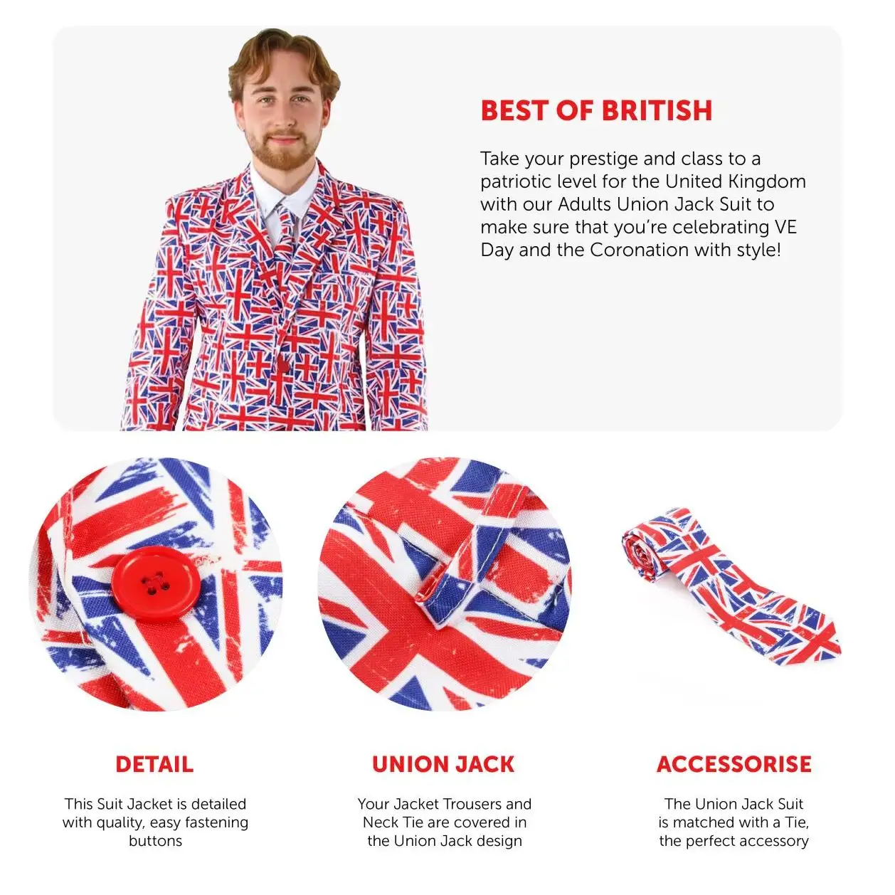UNION JACK SUIT: Take your prestige and class to a patriotic level for the United Kingdom with our Adults Union Jack Suit to make sure that you’re celebrating VE Day and the Coronation with style!