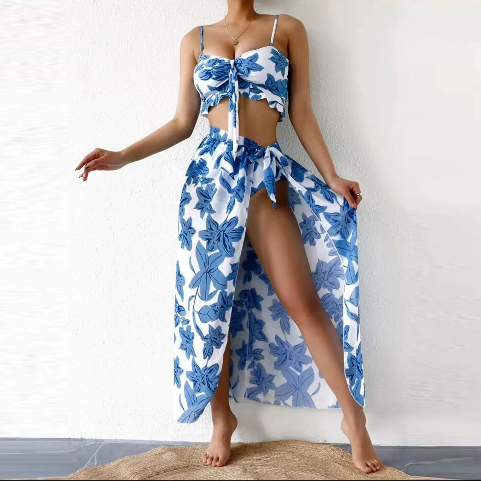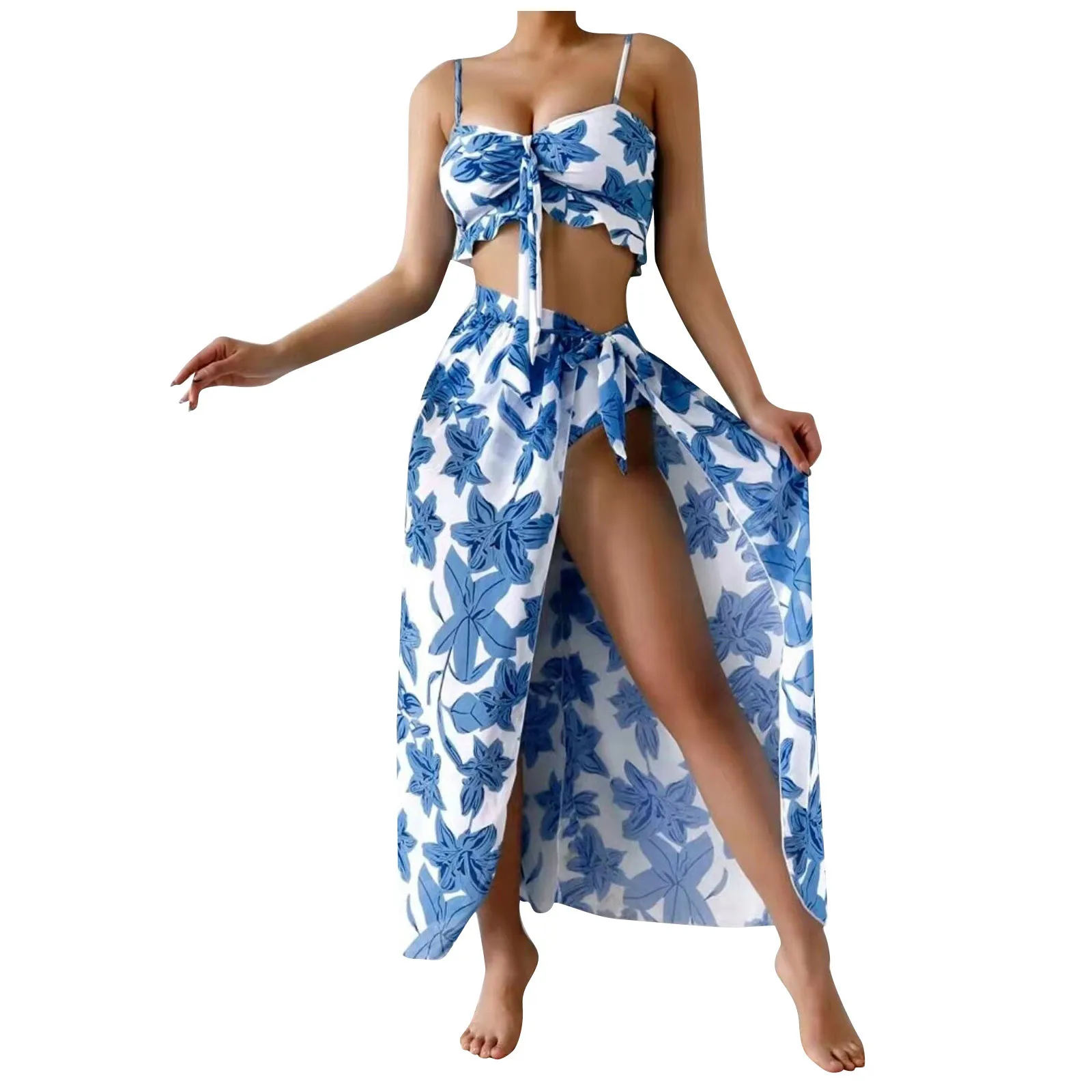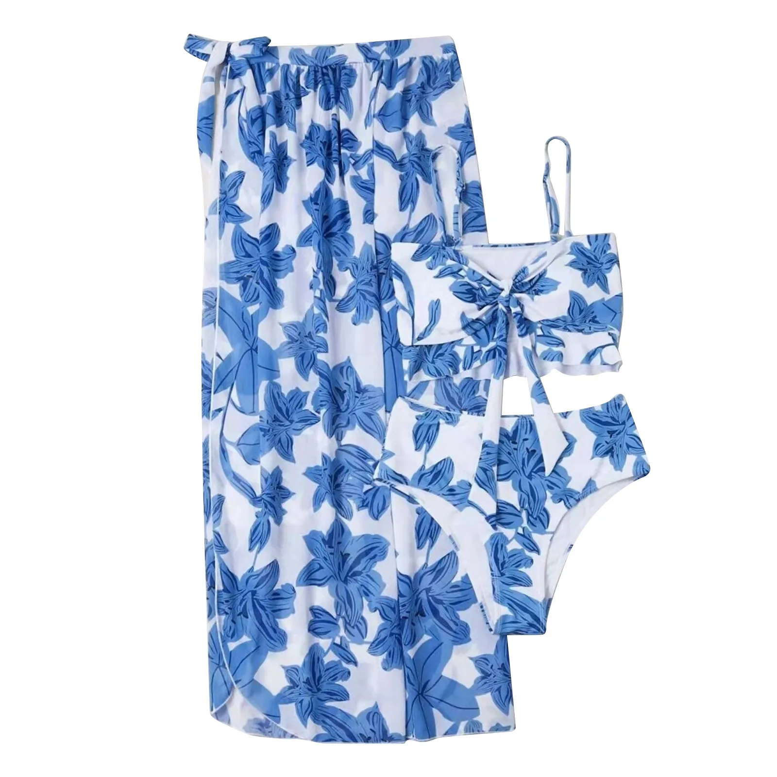 Fashion Women Printed High Waist Split Long Skirt Bikini Casual Swimsuit Set