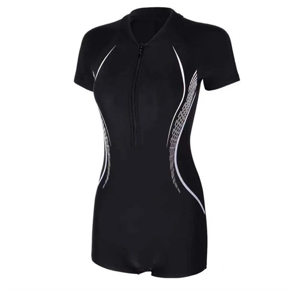 Short Sleeve Sports Swimwear Soft Quick-Drying One Piece Sports Swimsuit Zipper Bathing Suits Women