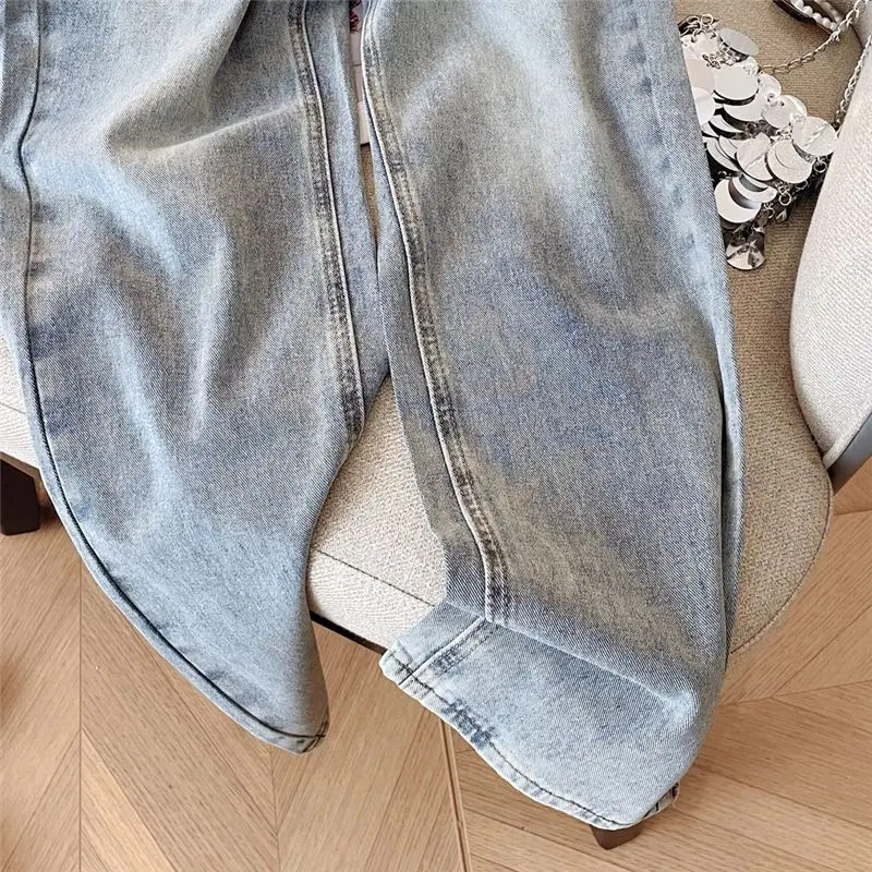 The high-waisted design of these jeans accentuates the waist, creating a flattering silhouette for all body types.