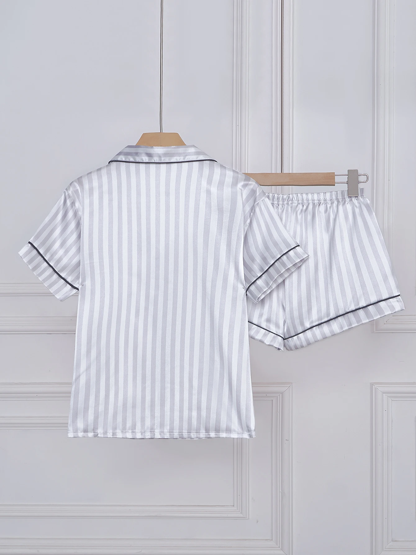 Turn-down Collar DetailThe turn-down collar detail adds a classic touch, making these pajamas suitable for both sleeping and casual wear.Satin Sleepwear MaterialCrafted from soft satin, these pajamas offer comfort and durability, ensuring a good night's rest.Striped Embroidered DesignThe elegant striped embroidery adds a touch of sophistication to these pajamas, perfect for a stylish night's sleep.Short Sleeve and Shorts SetThis short sleeve and shorts set provides a lightweight option for summer, keeping you cool and comfortable.Button DetailThe button detail adds a functional touch, allowing for easy wear and removal.