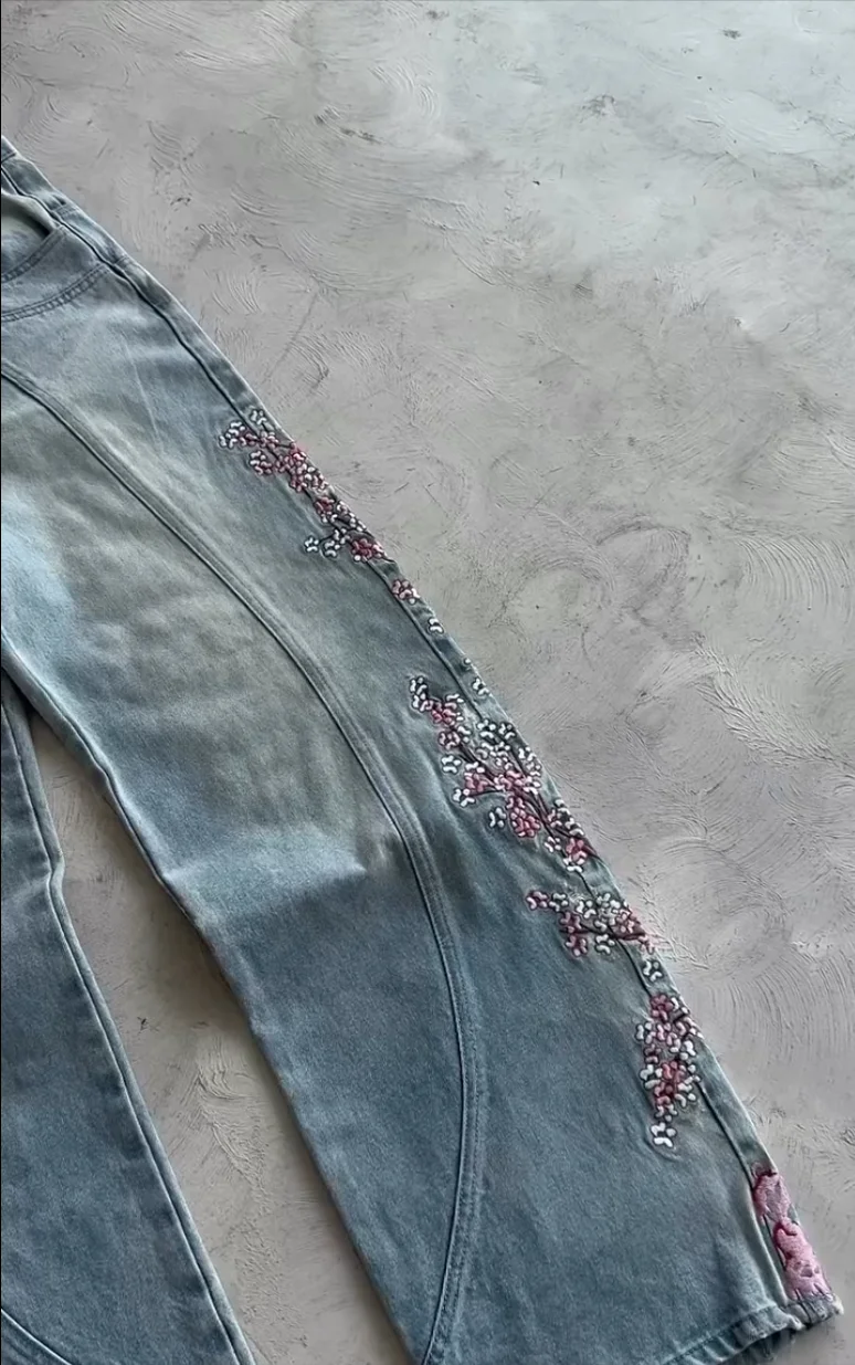Vintage Cherry Blossom Black Knight Embroidery Jeans Y2k Retro Baggy Straight Denim Pants Blue Wash Jean Men Clothing Streetwear