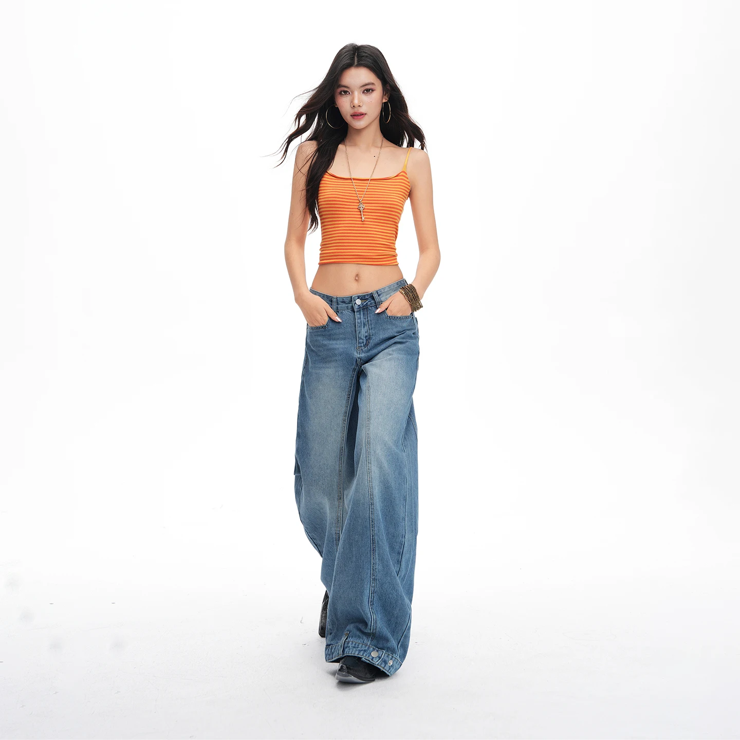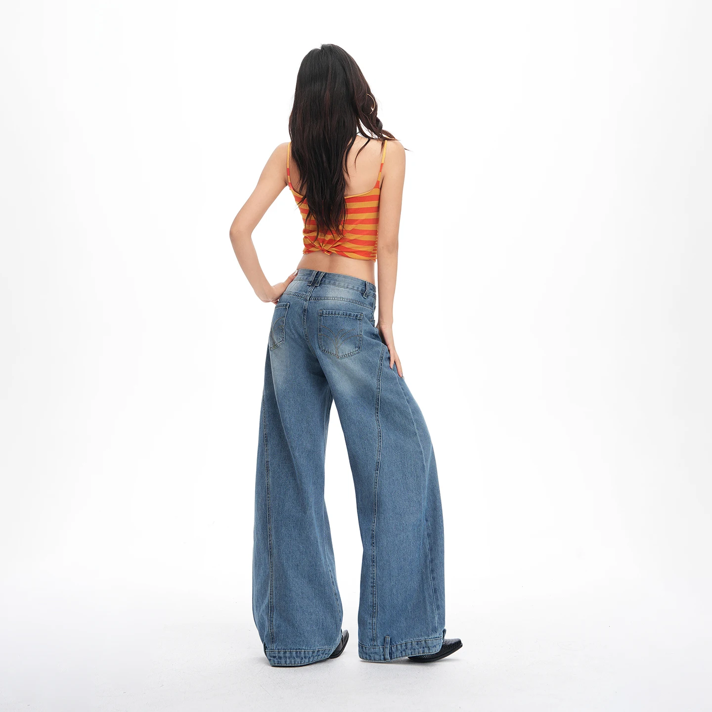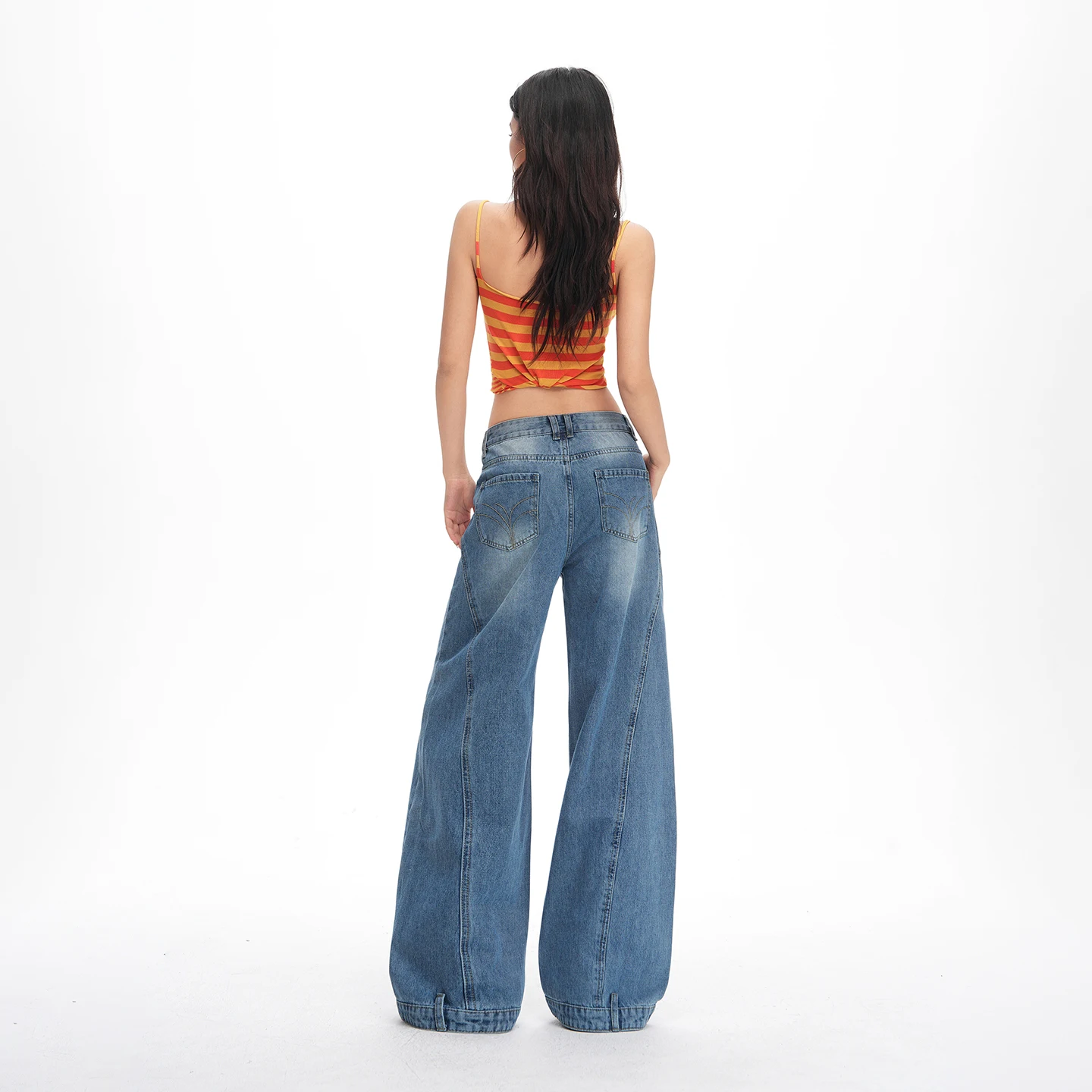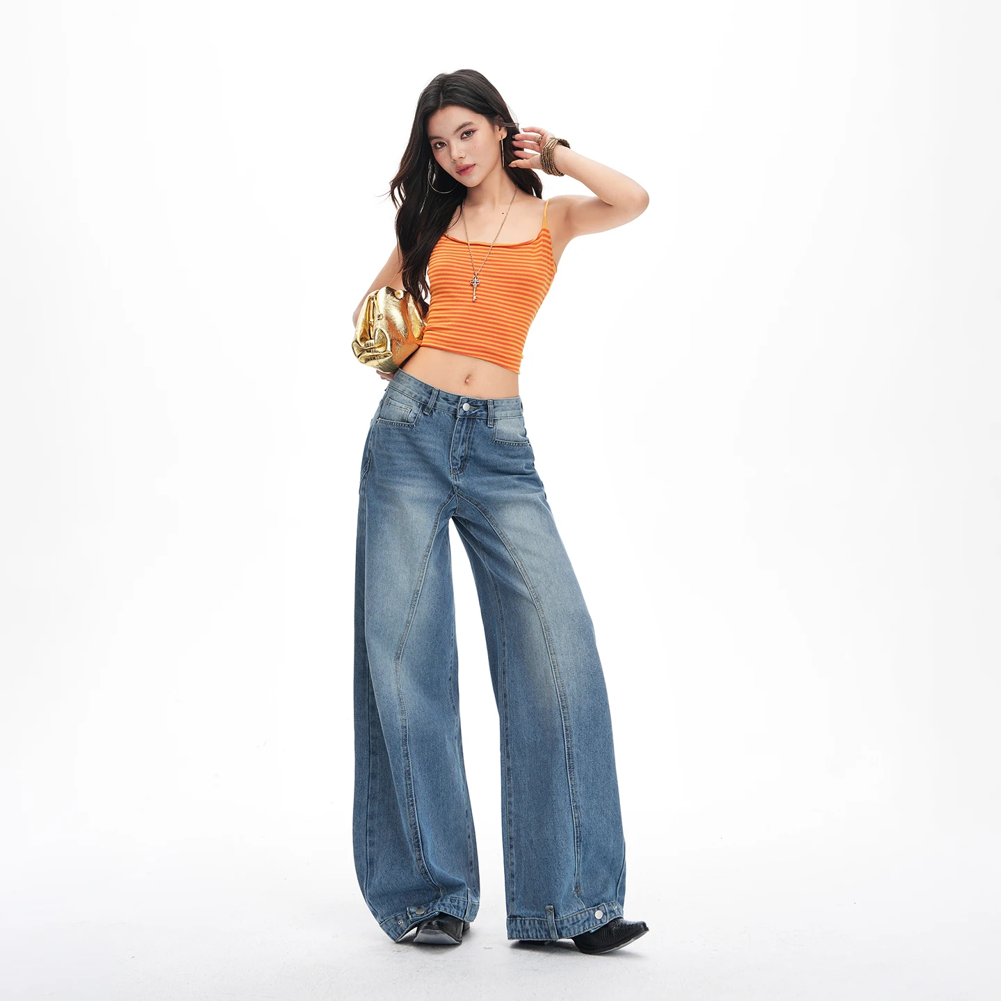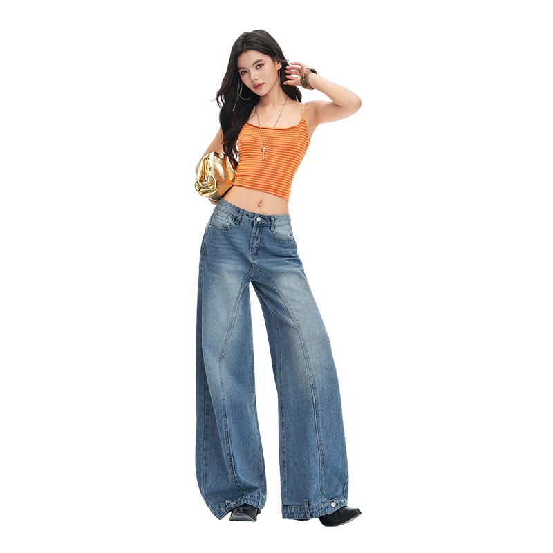 New retro-style washed distressed loose-fitting jeans for women with buttoned edges, curved three-dimensional cut, and wide-leg design.