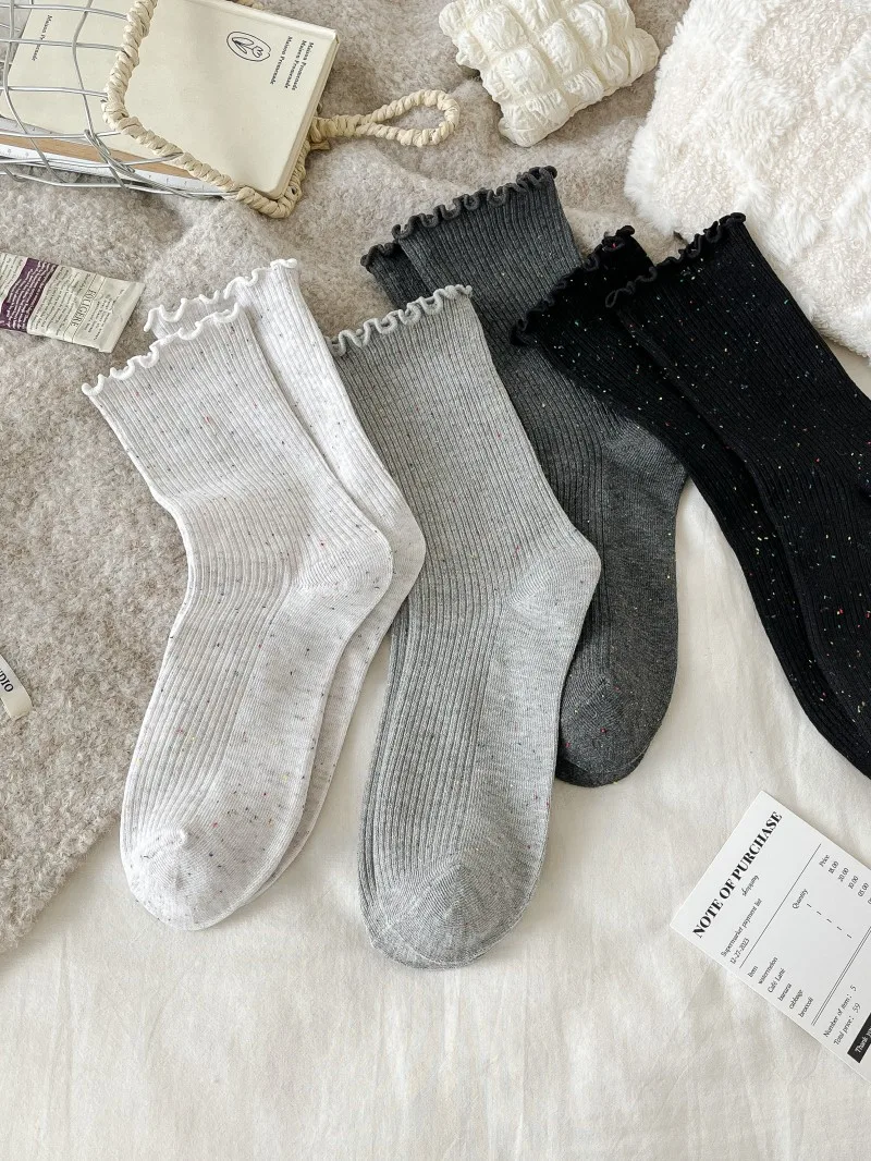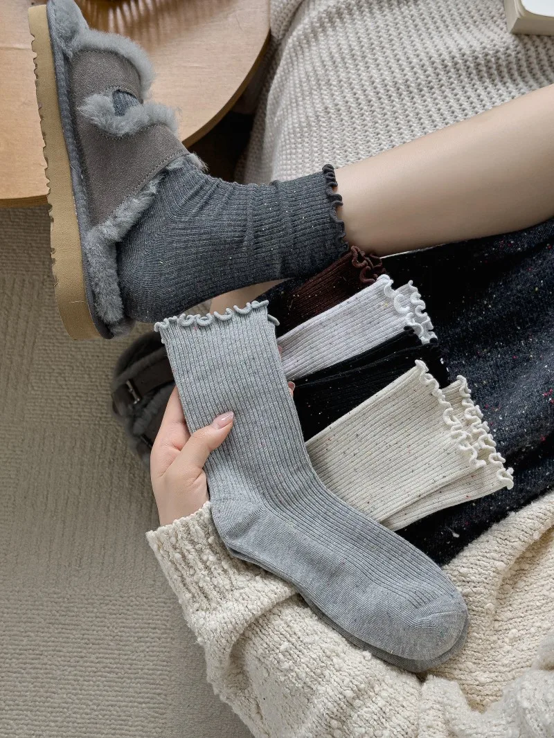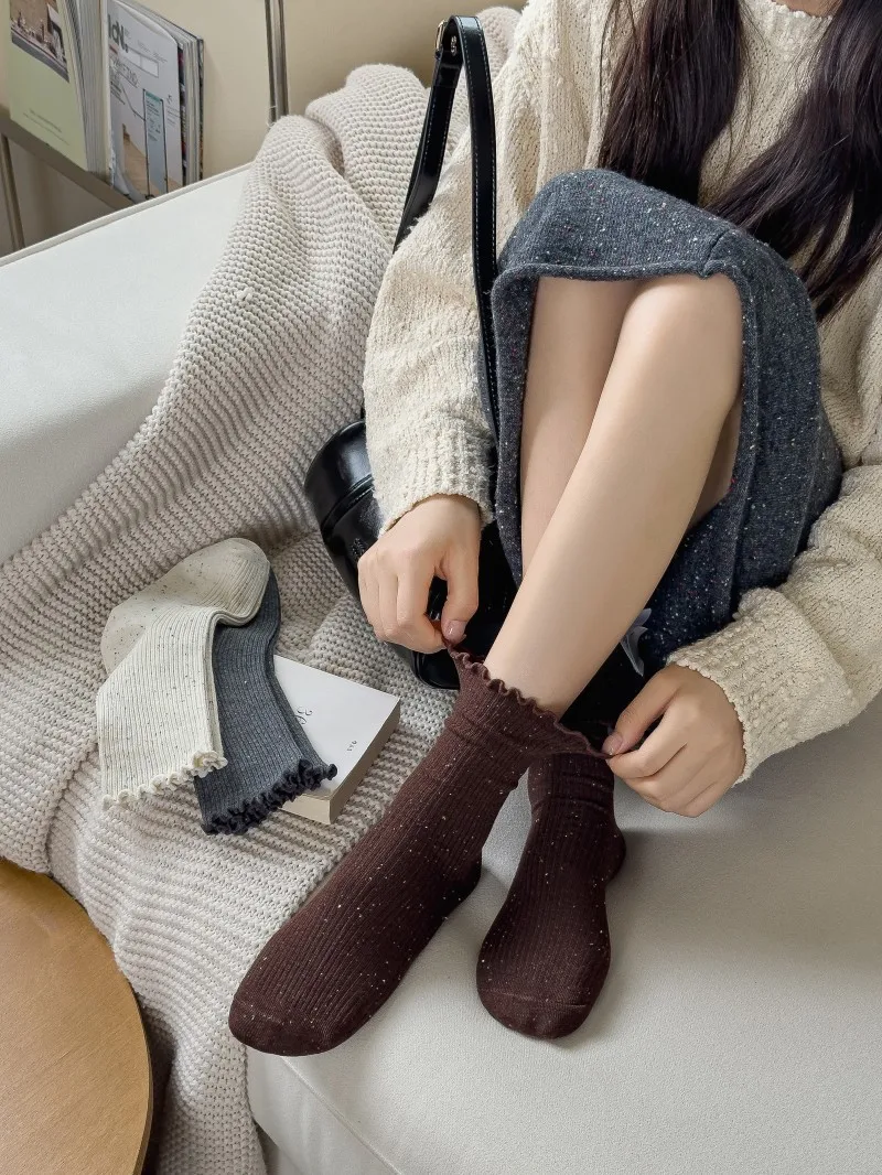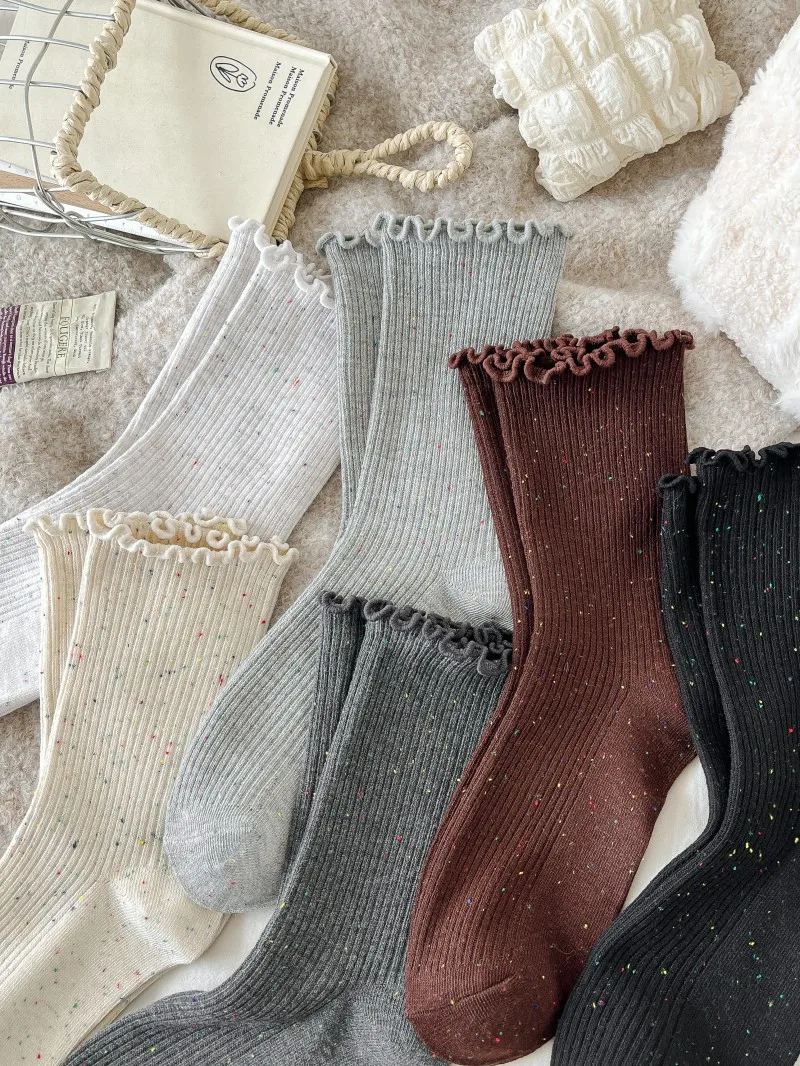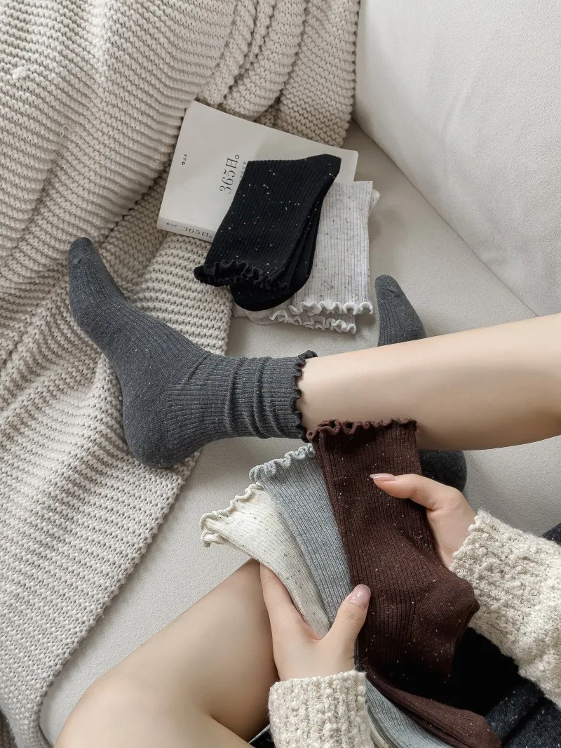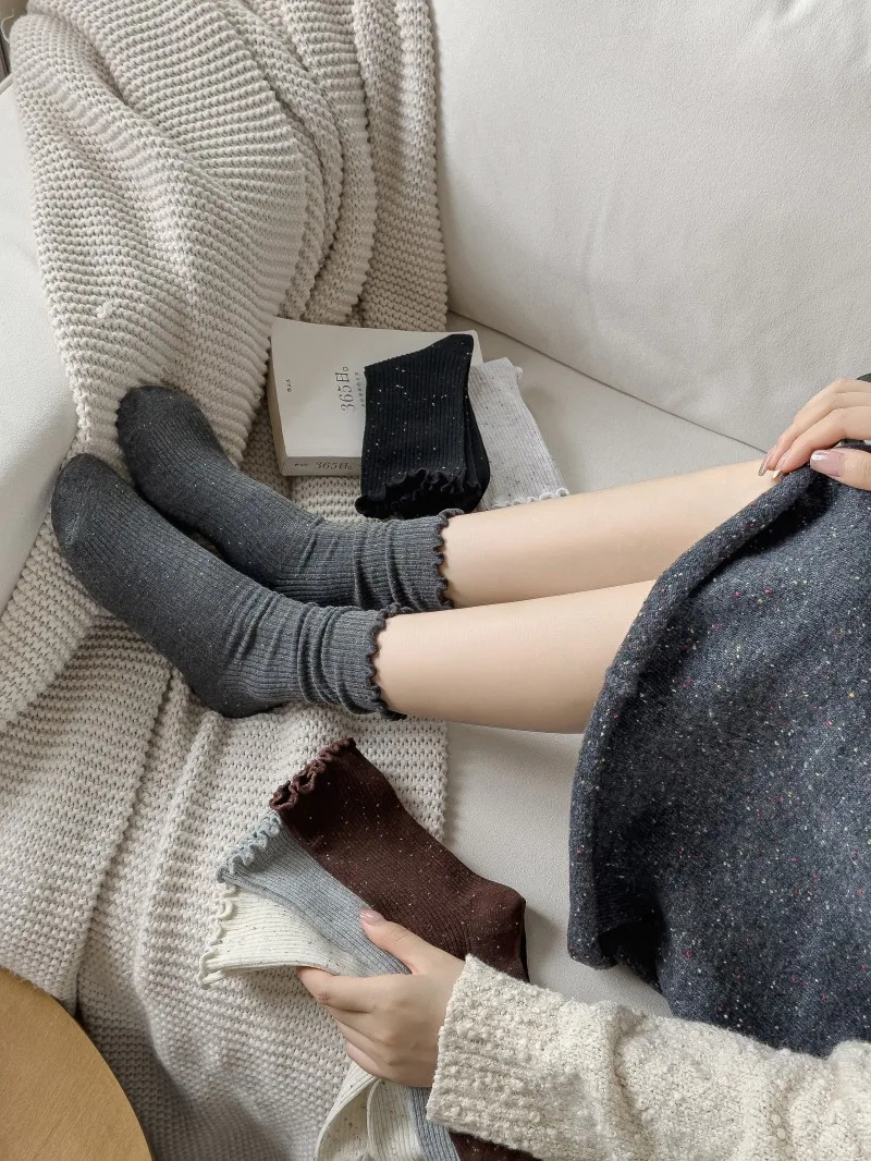 Woman Socks Autumn Winter New Solid Color Retro Frilly Ruffle Socks Female Casual Daily Preppy Style Japanese Crew Socks Girls