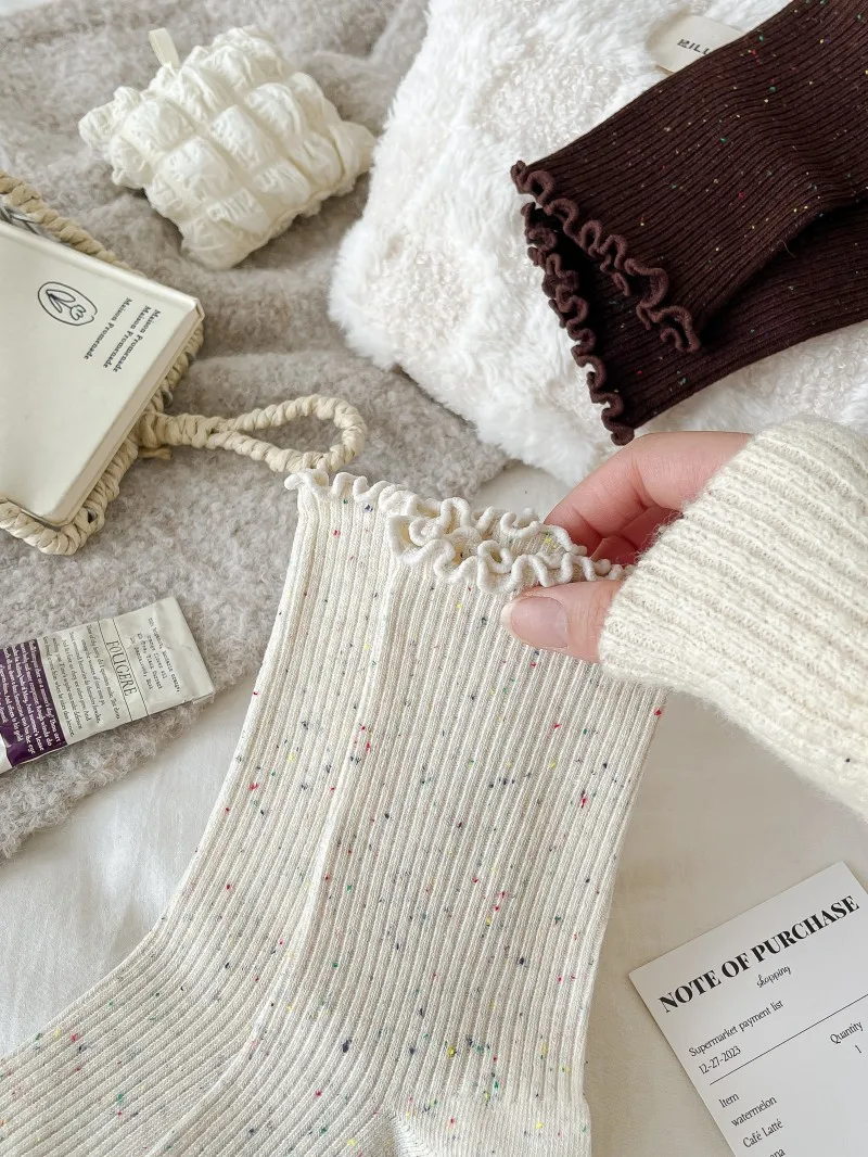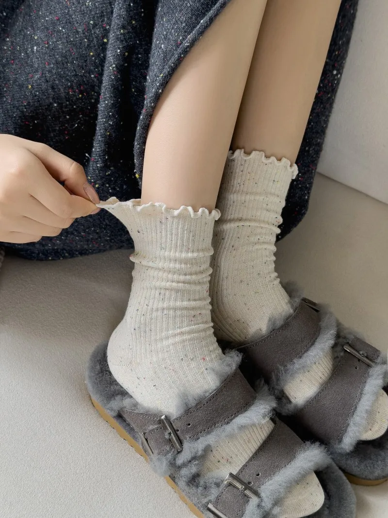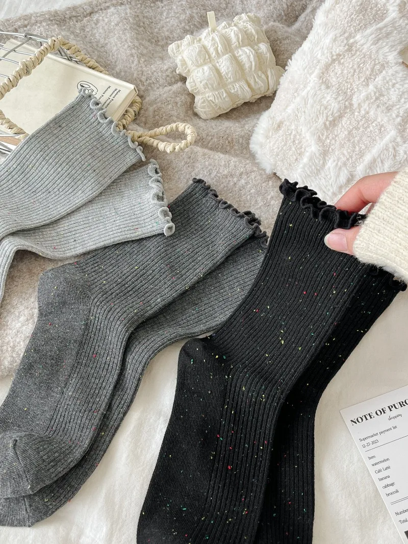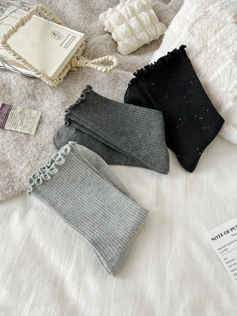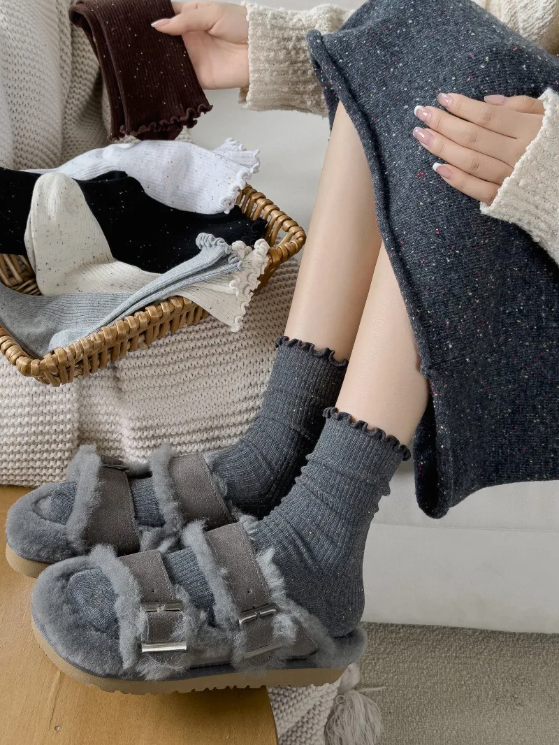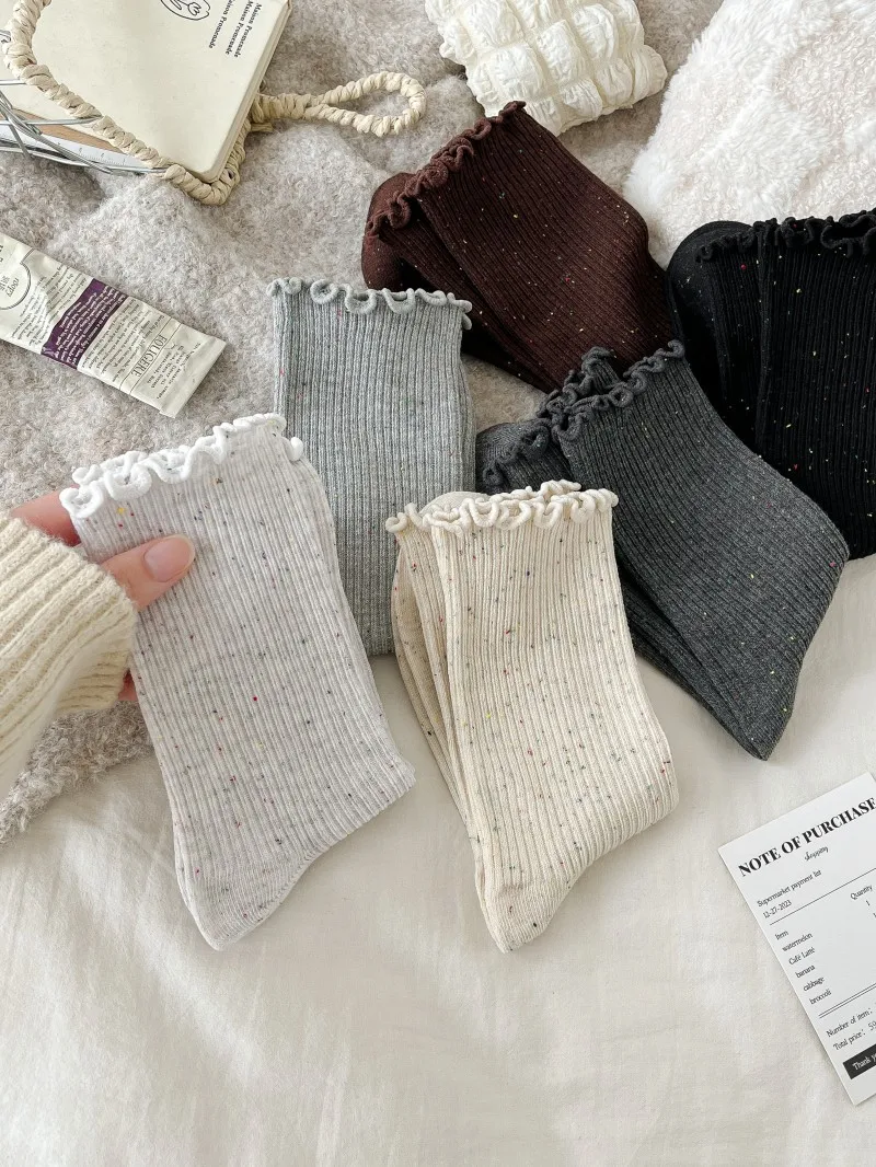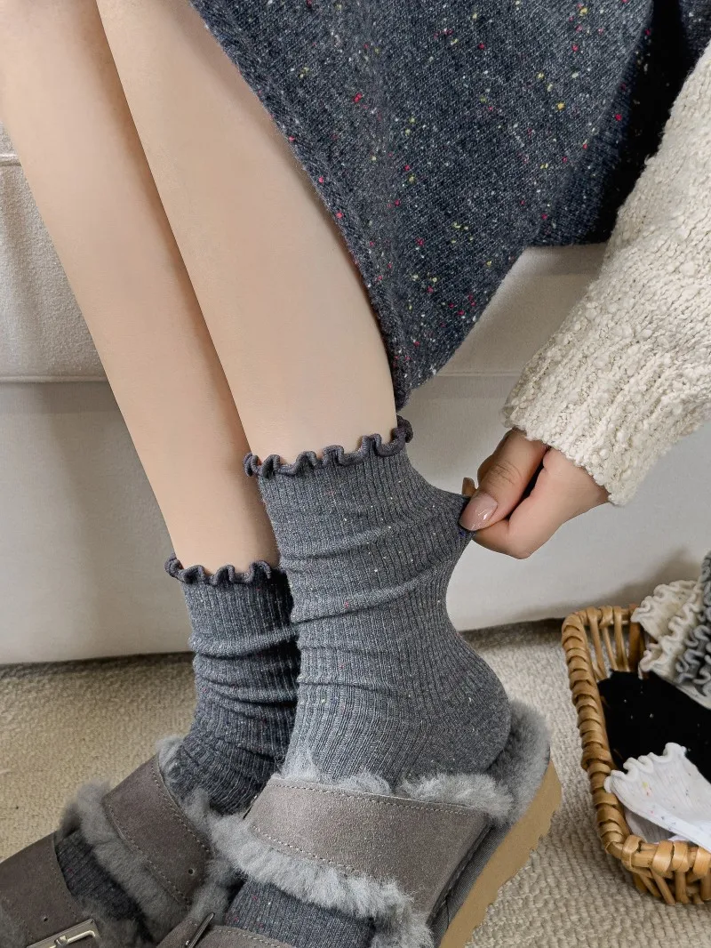 Woman Socks Autumn Winter New Solid Color Retro Frilly Ruffle Socks Female Casual Daily Preppy Style Japanese Crew Socks Girls